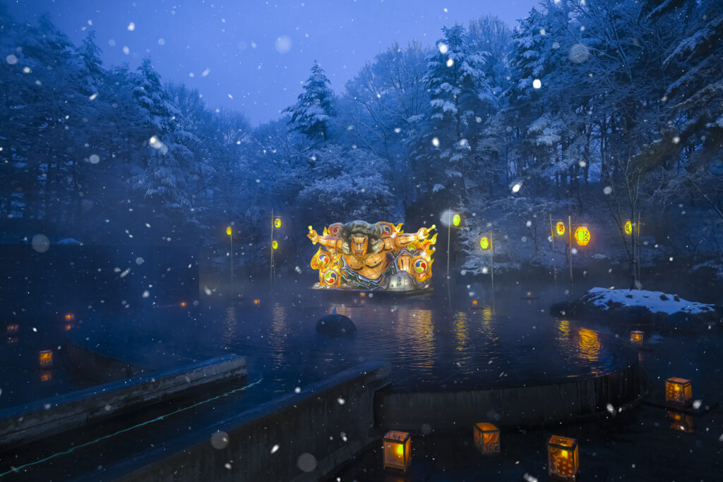 12月3日から2月28日までの限定で、浮湯の池に無数の灯篭が浮かび、雪景色の中でゆらめく光が広がります。